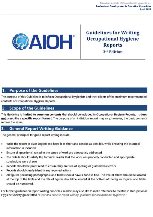The purpose of this Guideline is to inform Occupational Hygienists and their clients of the minimum recommended contents of Occupational Hygiene Reports.